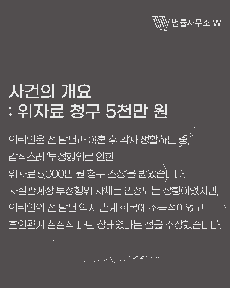 의뢰인은 부산에 거주하는 여성이었습니다. 이미 전 배우자와 이혼한 상태였고, 이혼 이후 별다른 문제 없이 생활을 이어가고 있던 중, 전 남편으로부터 ‘부정행위 위자료 청구 소장’을 받게 되었습니다.