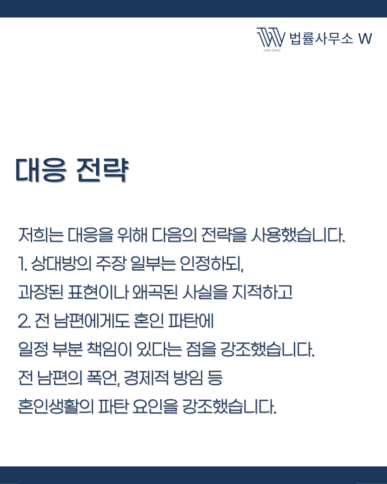 이를 위해 저는 전 남편의 언행, 혼인생활 중 갈등 구조, 경제·정서적 소외 사실 등 다양한 정황 자료를 확보하고 분석하여 소송 대응자료로 제출했습니다.