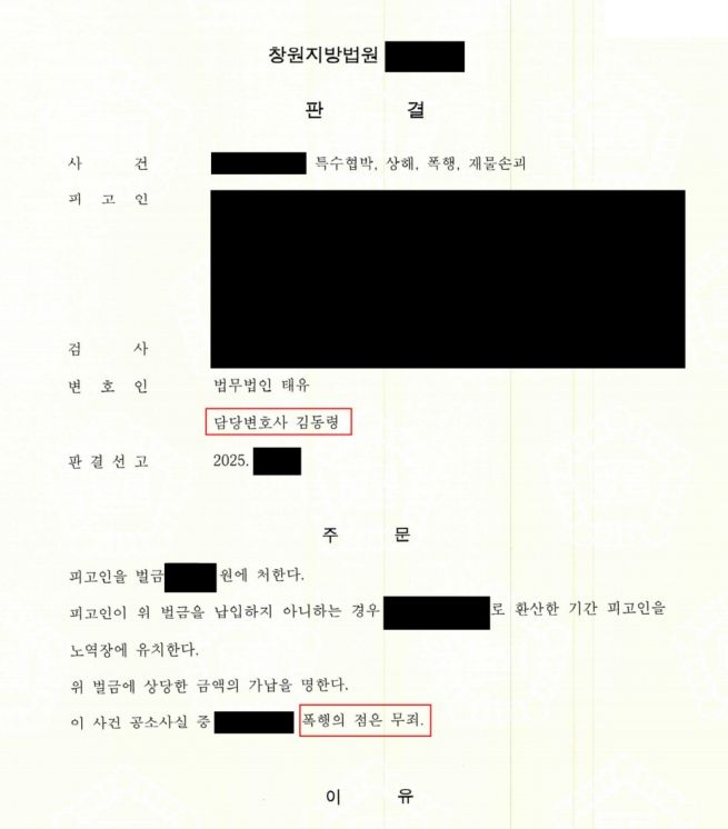 특수협박, 상해, 폭행, 손괴 등 여러 개의 죄명으로 재판을 받게 되어 실형 가능성이 농후하였지만, 이 중 폭행에 관하여는 무죄를, 나머지는 벌금형으로 감경된 사례입니다.