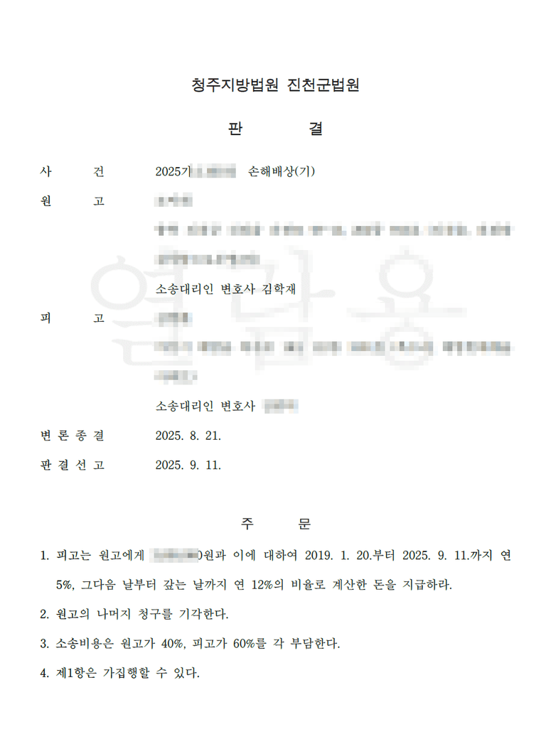 [전부승소] 2025년 9월 11일 손해배상사건 전부승소
