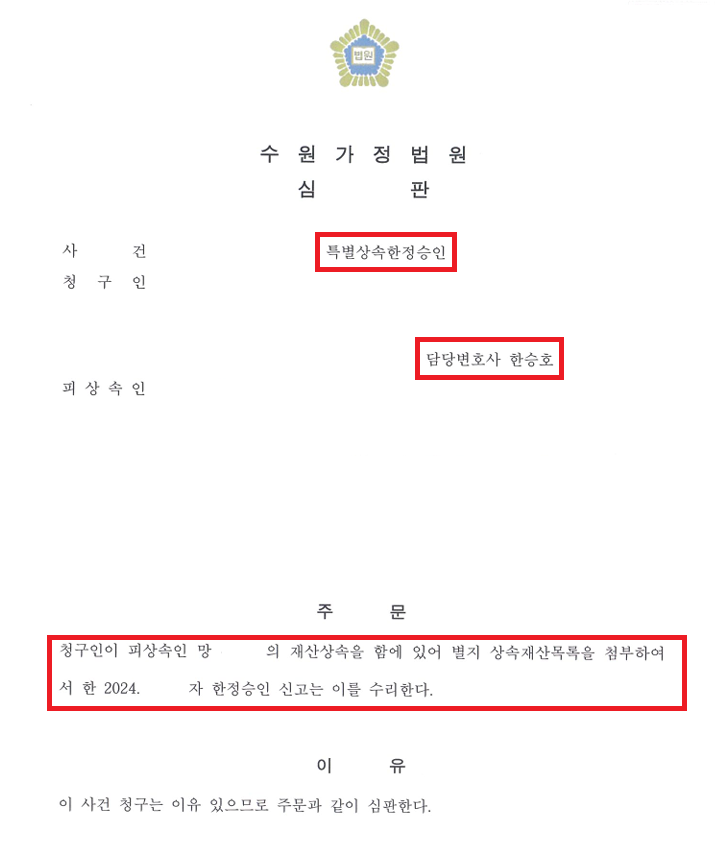 결국 법원은, 변호인의 의견을 받아들여 한정승인 신고를 수리하였고 의뢰인은 미처 알지 못했던 상속채무에서 벗어날 수 있었습니다.