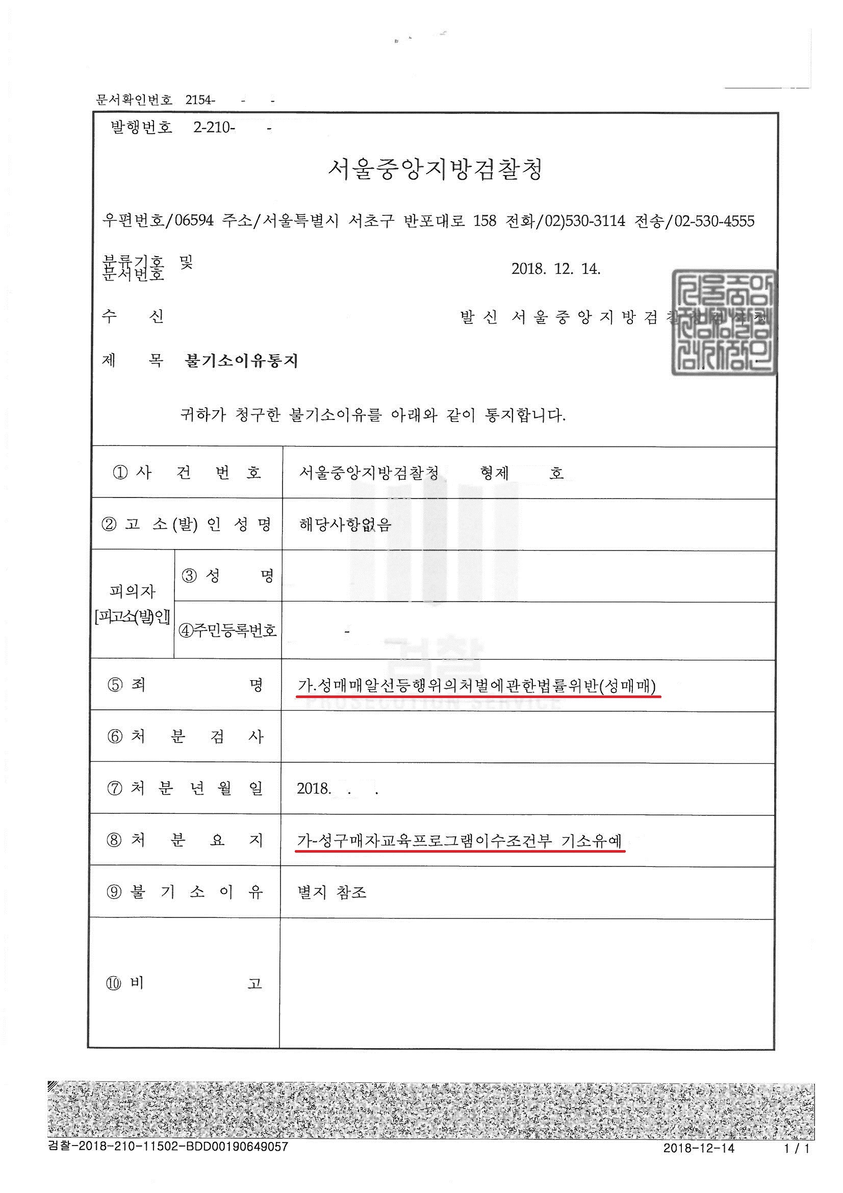 제가 안내해드린 다양한 양형자료를 적극적으로 제출하고 선처를 호소하는 변호인의견서를 통해 서울중앙지방검찰청은 의뢰인님께서 수 차례 성매매를 하였음에도 불구하고 "교육조건부 기소유예"처분을 내렸습니다.