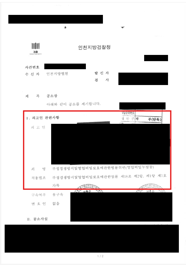 의뢰인께서 수집하신 정보를 바탕으로 면밀한 법리검토 끝에 상대방을 고소하였고, 상대방은 혐의가 인정되어 아래와 같이 기소되었습니다.