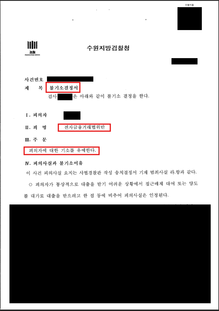 저는 의뢰인께서 생계를 이유로 대출상품을 알아보다가 이 사건에 연루된 점과, 그 전까지 별다른 전과기록이 없이 성실하게 살아온 점 등을 강조하면서 제반 경위에 비추어 최대한 선처를 하여 달라고 읍소하였습니다. 이에 통상적으로 전자금융거래법위반 혐의에 대해서는 사법경찰관 단계에서 1회의 조사로 사건이 마무리되는 것과 달리, 검찰 단계에서 의뢰인에 대한 추가 조사가 이루어지게 되었습니다. 이는 의뢰인에게 범죄에 가공하려는 의사가 정말 있었는지 면밀히 살펴보기 위한 것이었습니다.