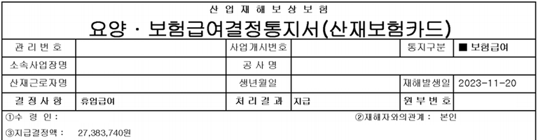 “[근로복지공단] OOO님에게 장해일시금 21,651,160원을 금일 지급 예정입니다.”
