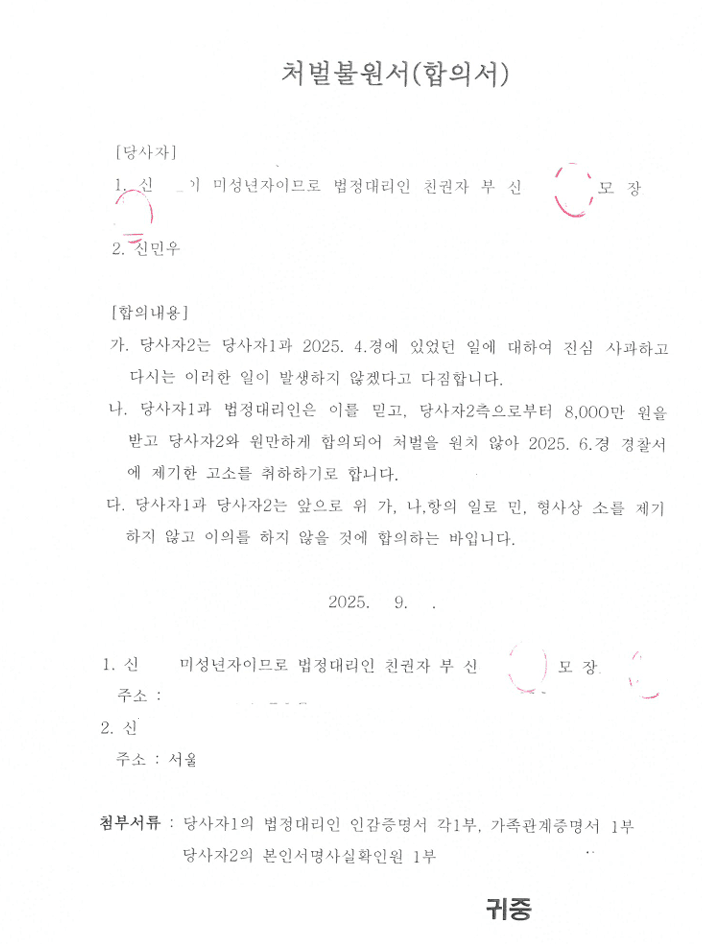 중대범죄인만큼 피의자 역시 합의에 진심이었습니다. 다만, 처음에는 턱없이 적은 금액을 제시하여 대리인인 제가 합의를 거절하였고 점차 금액을 올려 아래와 같이 8천만원에 합의를 할 수 있었습니다.