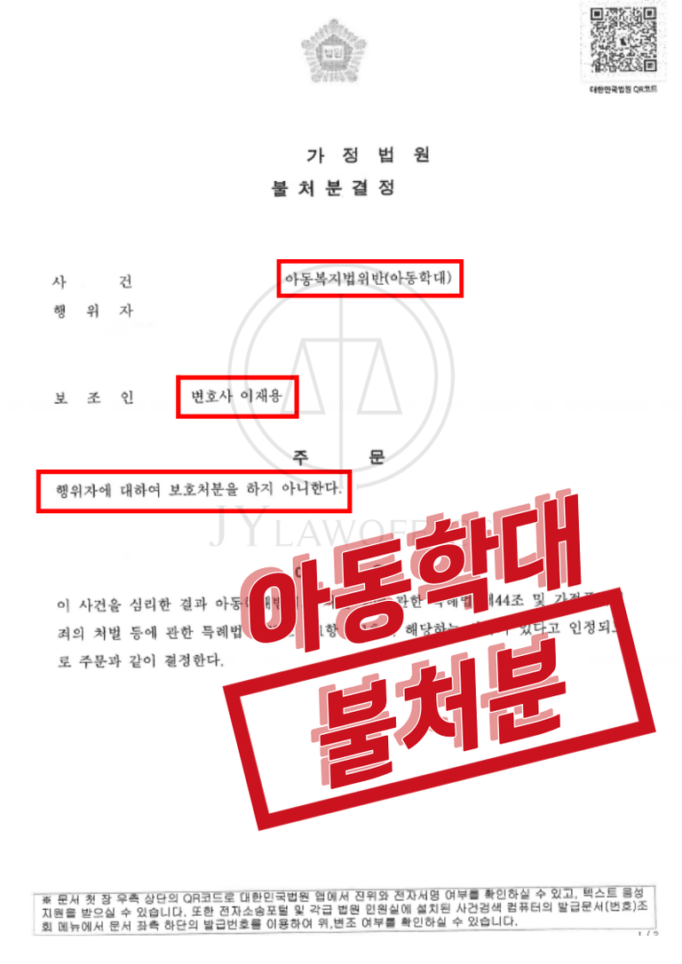 이와 같은 본 변호인의 조력으로 의뢰인은 아동학대 사건에서 불처분 결정을 받고 사건을 무사히 종결시킬 수 있었습니다.