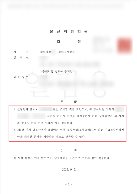 법원은 위와 같은 주장을 받아주셔서 공탁금을 전액 보증보험으로 대체하는 내용의 강제집행정지 결정을 내려주셨습니다.