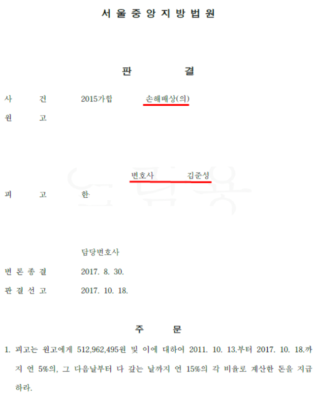 서울중앙지방법원은 원고의 위 주장을 받아들여 피고는 원고에게 512,962,495원을 지급하라는 판결을 선고하였습니다.