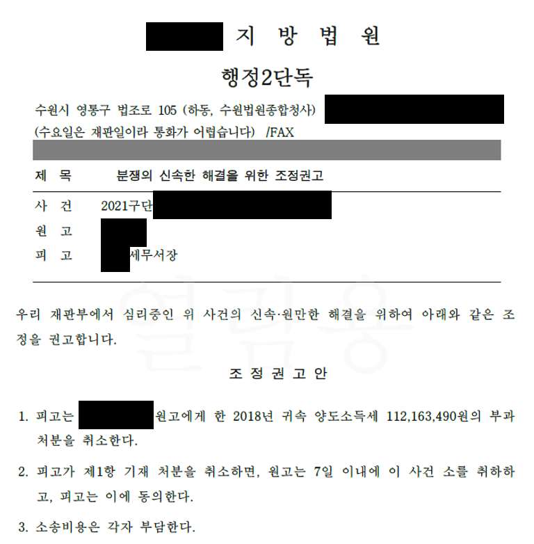 법원은 감정평가결과에 따라, 원고와 피고에게 다음과 같이 조정권고를 하였습니다.
