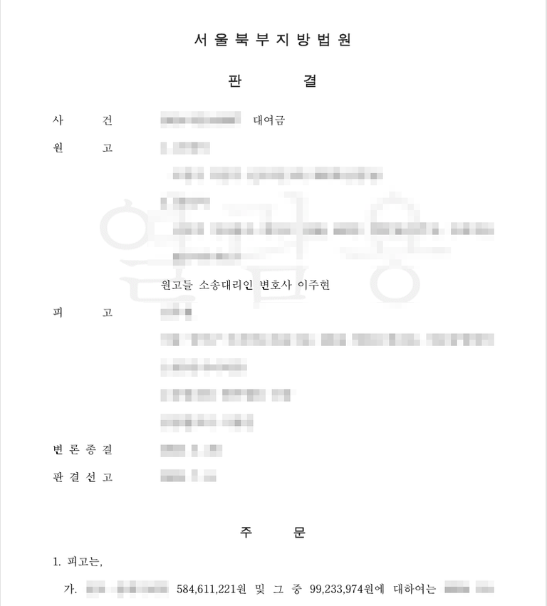 본 사안의 경우 채무자의 부동산이 파악이 되었고, 해당 부동산의 시세가 높은 측면에 있어서 부동산 가압류가 주요하였고, 소송절차에 있어서도 위와 같은 가압류가 된 점이 승소로의, 그리고 보다 빠른 마무리에 주요한 역할을 하였습니다. 현재 부동산강제경매 중이기는 하나 위와 같은 시세상 의뢰인이 만족할 만한 배당을 받을 수 있을 것으로 보이기에 성공적인 사례로 기억됩니다.