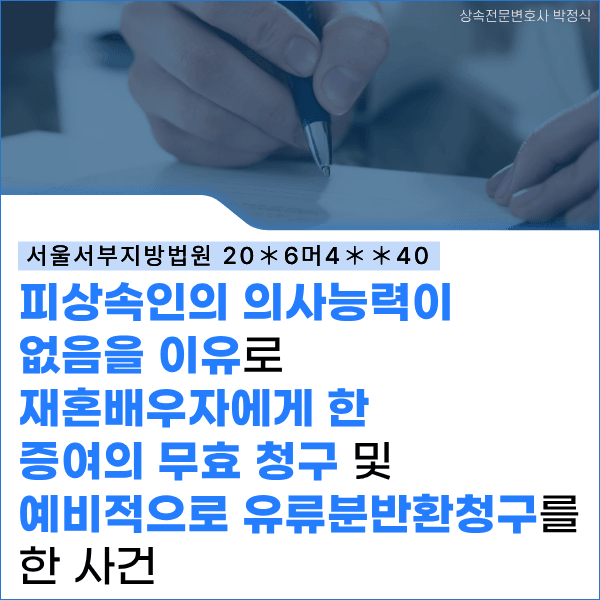 피상속인은 4명의 자녀를 두고 있었고 배우자는 사별하였습니다. 혼자 생활하던 피상속인은 등산 동호회에서 만난 여성분과 교제를 하다가 사망직전에 혼인신고를 하였고, 재혼한 배우자는 피상속인으로부터 상당한 재산을 증여받았습니다. 피상속인 사망후 이런 사실을 알게 된 전처 자녀분들은 재혼 배우자를 상대로 증여한 재산의 무효를 주장하면서, 예비적으로 증여가 유효하다면 유류분반환청구를 한 사건입니다. 피상속인은 절대 혼인신고를 하지 않겠다고 평소 자녀들에게 말해왔기 때문에 자녀들은 피상속인과 피고의 혼인신고에 대해서 상당히 의심하고 있었고 당시 피상속인은 알츠하이머병을 앓고 있었습니다.