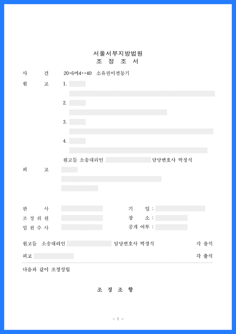 피상속인의 증여당시 정상적인 의사능력이 있었다는 것을 전제로, 피고인 재혼배우자분이 증여받은 토지, 은행예금 등을 기초로 일정 비율의 금원을 원고들에게 지급하는 조정안을 제시하였고, 이에 대해서 원고와 피고들이 모두 조정을 받아들여서 임의조정이 성립되었습니다.