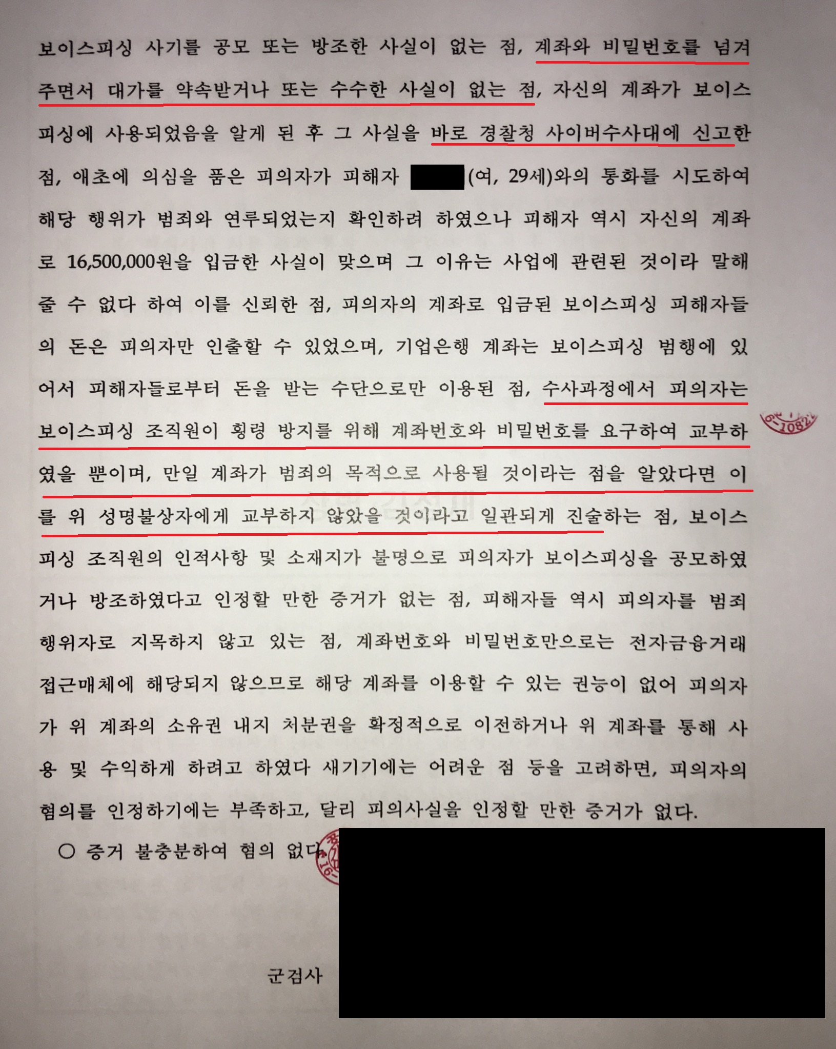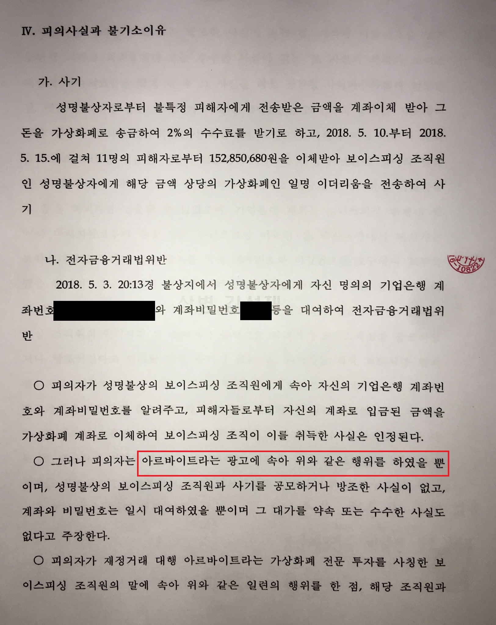 1) 의뢰인은 보이스피싱으로 인한 피해 금액인 것을 모르고 아르바이트를 하였을 뿐이라는 등의 유리한 사실 관게를 정리/주장하고