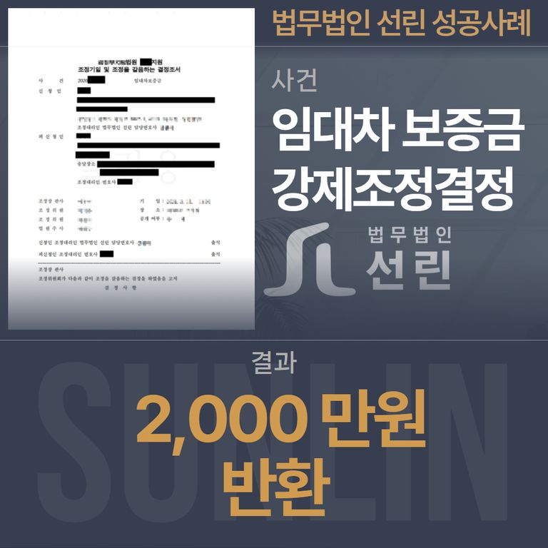 집주인이 인테리어를 약속하고 비용까지 받았음에도 제대로 이행하지 않은 채 보증금과 비용을 반환하지 않은 사건에서, 법무법인 선린은 조정 결정을 통해 최소한 임대차보증금 2,000만 원을 확보할 수 있었습니다.