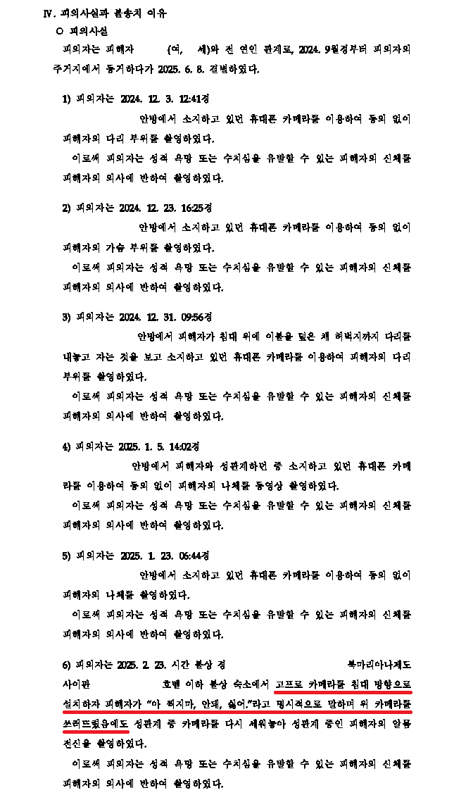 A씨는 여자친구 B씨와 교제하면서 총 6회에 걸쳐 B씨의 성적 모습을 촬영하였고, 그중 2025. 2. 23.경 사이판에 여행을 갔을 때는 B씨와 성관계 모습을 촬영하기 위해 고프로를 설치할 때 B씨가 "아 찍지마, 안돼, 싫어."라고 말하며 고프로를 쓰러뜨렸음에도 다시 세워 촬영하였습니다.