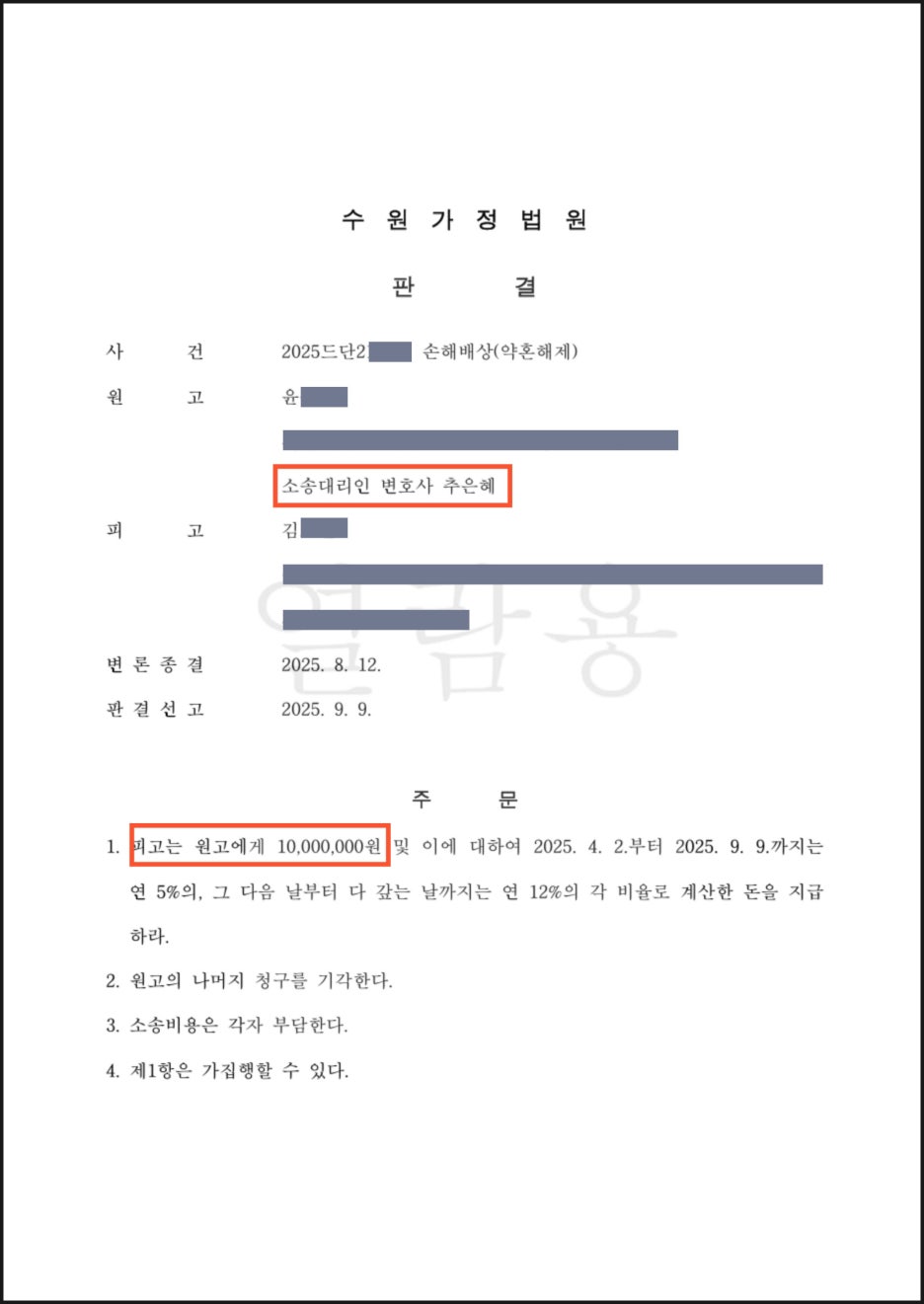 의뢰인이 청구한 금액 전부는 아니었지만, 피고의 잘못을 명확히 인정받고 정신적 고통에 대한 정당한 배상을 받아냈다는 점에서 매우 성공적인 결과입니다.