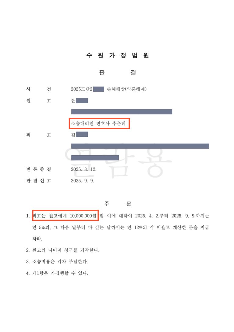 약혼 해제로 인한 위자료를 받아낸 성공 사례입니다.