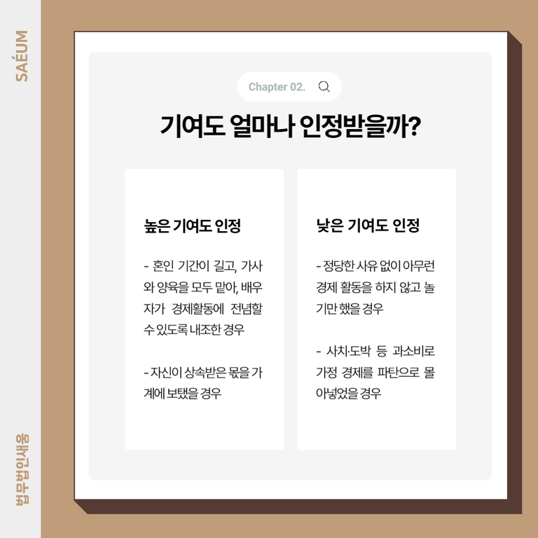 어떤 분들은 전업주부로 생활하면서 직접적인 경제활동을 하지 않아 불리하다고 생각하시는데, 꼭 그렇지는 않습니다. 앞서 설명한 대로, 기여도란 가정의 유지에 기여한 직간접적 모든 활동을 포함합니다.