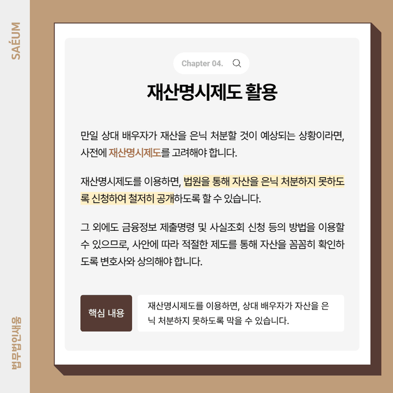 만일 남편이 이러한 꼼수를 쓸 것으로 예상된다면, 사전에 재산명시제도를 고려해야 합니다. 법원을 통해 자산을 은닉·처분하지 못하도록 신청하여 철저히 공개하도록 할 수 있습니다. 그 외에도 금융정보 제출명령 및 사실조회 신청 등의 방법을 이용할 수 있으므로, 사안에 따라 적절한 제도를 통해 자산을 꼼꼼히 확인하도록 변호사와 상의해야 합니다.