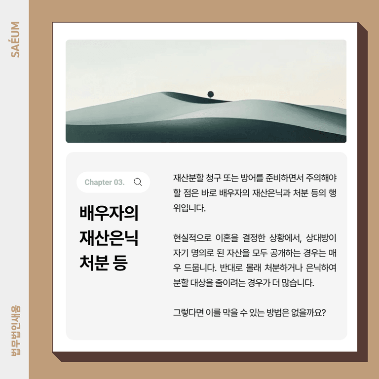 방어를 위한 객관적 근거 수집과 함께 주의해야 할 점은 바로 배우자의 자산 은닉입니다. 현실적으로이혼을 결정한 상황에서, 상대 배우자가 순순히 자신의 명의로 된 자산을 공개하는 경우는 드뭅니다. 반대로 몰래 처분하거나 은닉하여 분할 대상을 줄이려는 경우가 더 많습니다.