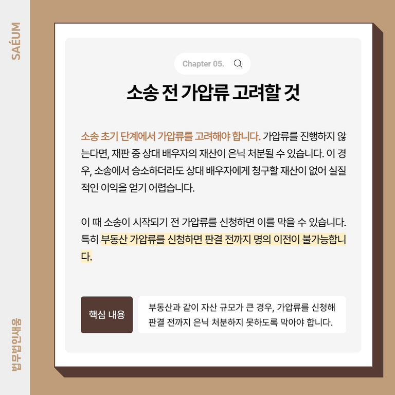 또 한 가지 주의할 점은, 소송 초기 단계에서 가압류를 고려해야 한다는 것입니다. 재판이 진행된 후 대부분의 몫을 다른 이에게 넘긴다면, 원하는 결과를 얻더라도 실질적으로 상대 자산이 없어 불리한 결과를 초래할 수 있습니다.