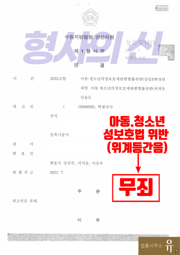 2. 학원강사 미성년자강간(아청법 위계등간음) – 무죄