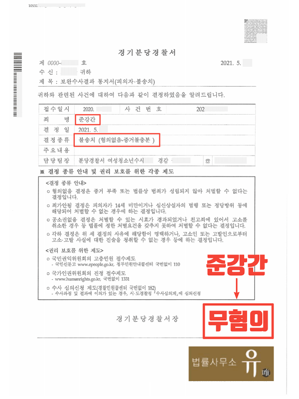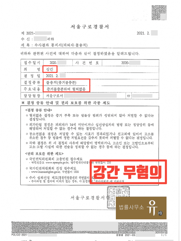 무혐의 처분을 받은 사례입니다.
