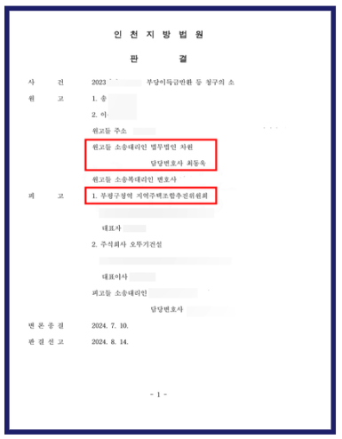 오늘은 인천부평구청역 지역주택조합과 대행사 오뚜기건설을 대상으로 최동욱 변호사가 4명의 의뢰인을 위해 소송을 제기하여 전액 승소 후 현재 강제 집행 중인 사례를 소개하려고 합니다. 만약 토지 확보 비율에 대한 잘못된 안내를 믿고 계약을 체결하여 어려움이 있으시다면, 아래 내용을 참조하여 피해를 회복하시기 바랍니다.