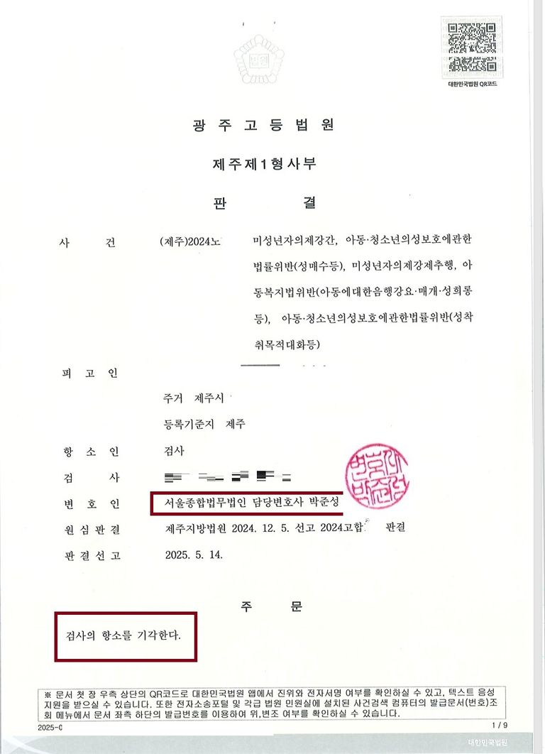 3. 결과 - 검사 항소 기각, 성착취목적대화 무죄 및 미성년자의제강간 등 집행유예