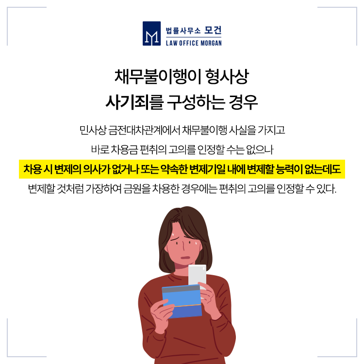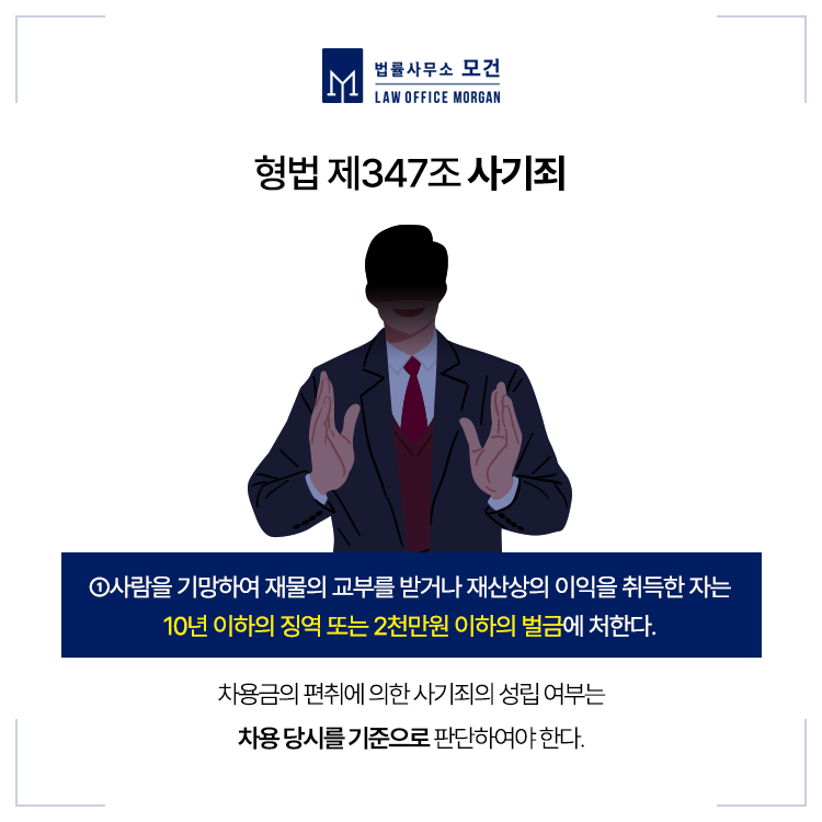빌린돈 때문에 민사가 아닌 형사고소 사건에 휘말리게 되는 사례들이 있습니다. 약속한 변제기일을 지키지 못하였다고 해서 무조건 사기죄로 처벌되는 것은 아니지만, 편취의 고의를 가지고 상대방을 기망하고 금전을 차용하고 갚지 않았다면 <사기죄> 가 성립할 수도 있습니다.