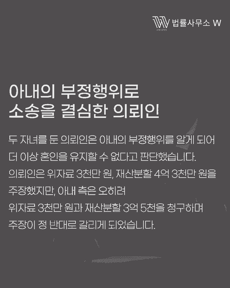 이혼소송에서는 종종 양측이 모두 위자료와 재산을 청구하는 ‘맞불 소송’이 벌어지기도 합니다. 이번 사건 역시 원고가 아내의 부정행위를 이유로 위자료 3,000만 원과 재산분할 4억 3,000만 원을 청구하자, 피고인 아내는 반대로 “남편이 유책”이라며 위자료 3,000만 원과 재산분할 3억 5,000만 원을 반소로 청구했습니다.