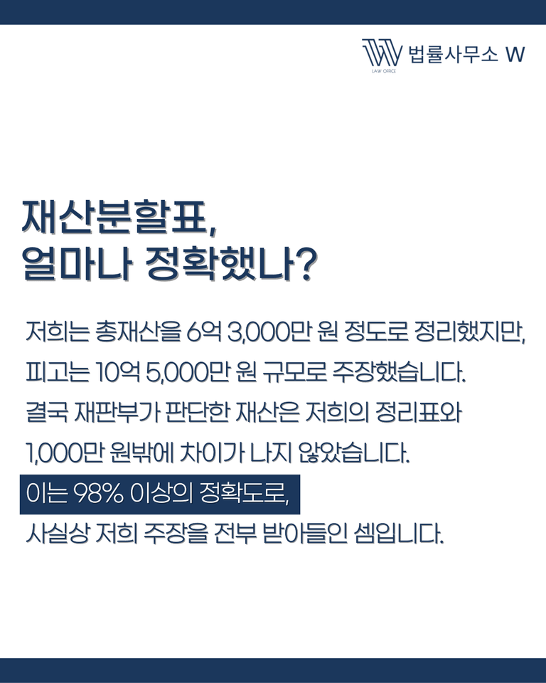 재판부는 이 두 주장을 비교한 뒤, 제가 제출한 재산분할표와 1,000만 원 이내의 차이만 있는 판단을 내렸습니다. 이는 약 1.5% 내외의 오차로, 판결문과 98% 이상 일치한 분석자료라는 의미입니다.