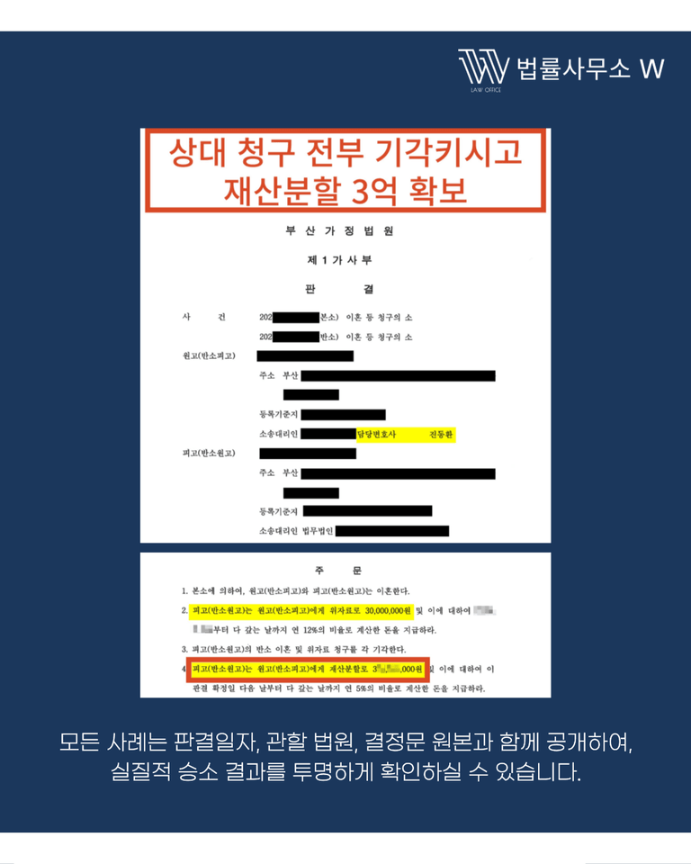 최종적으로 법원은 피고의 반소를 전부 기각하고, 의뢰인인 원고가 청구한 위자료 3,000만 원을 전부 인정했습니다. 재산분할에서도 저희 주장에 기초해 약 3억 원 규모의 재산을 확보했습니다.