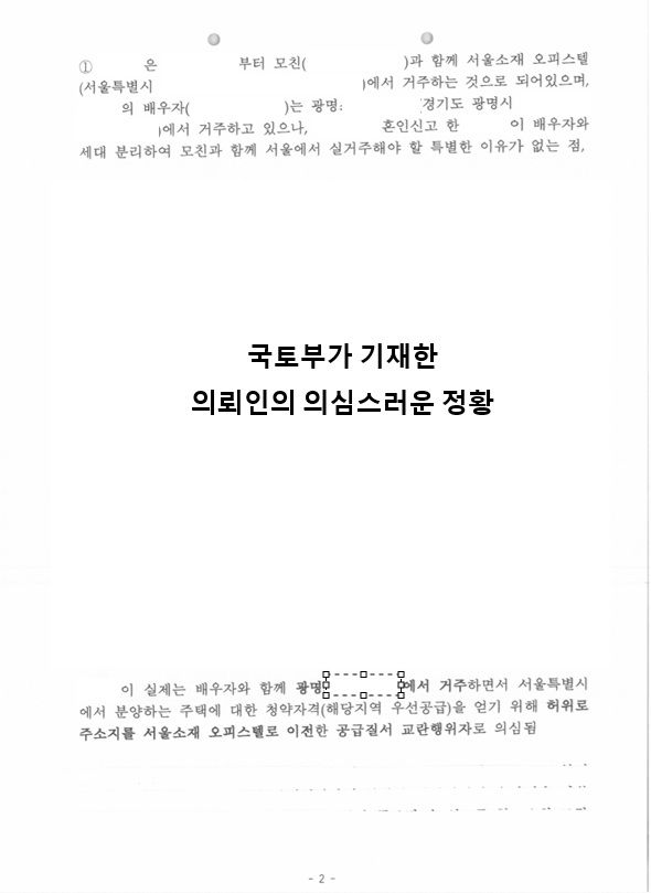 이러한 생활방식에 대하여 국토부는 "일반적이지 않다"라면서 "사실은 아내와 함께 경기도에서 사는게 분명한데 주민등록상 주소지만 서울로 두어 청약을 신청한 것 아니냐"라며 수사의뢰를 하였습니다.