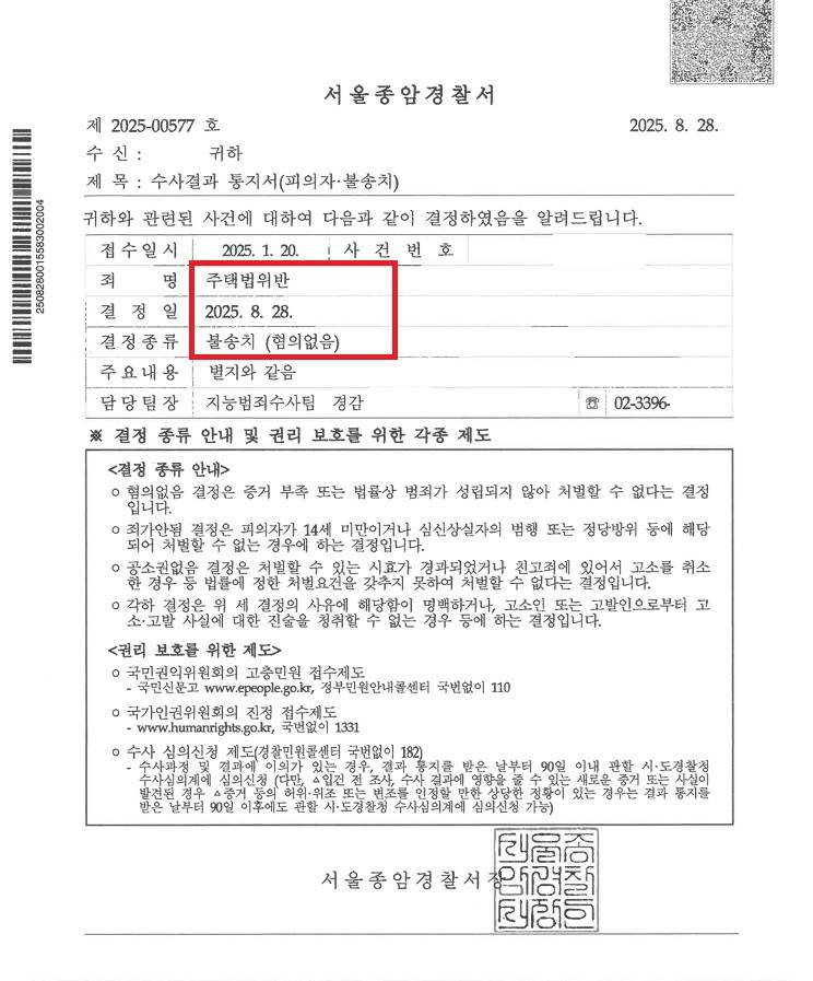 아래와 같이 이 사건은 불송치로 종결되셨습니다.