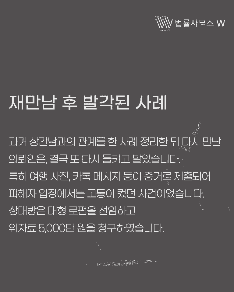 이 사건에서 의뢰인은 상간남과의 교제를 인정하였고, 과거 한 번 들킨 뒤 관계를 정리하기로 했으나 다시 만나게 되었고, 결국 상대 배우자에게 또 들킨 상황이었습니다. 특히 두 사람의 여행 사진, 카톡 메시지 등이 증거로 제출되어 피해자 입장에서는 고통이 컸습니다.