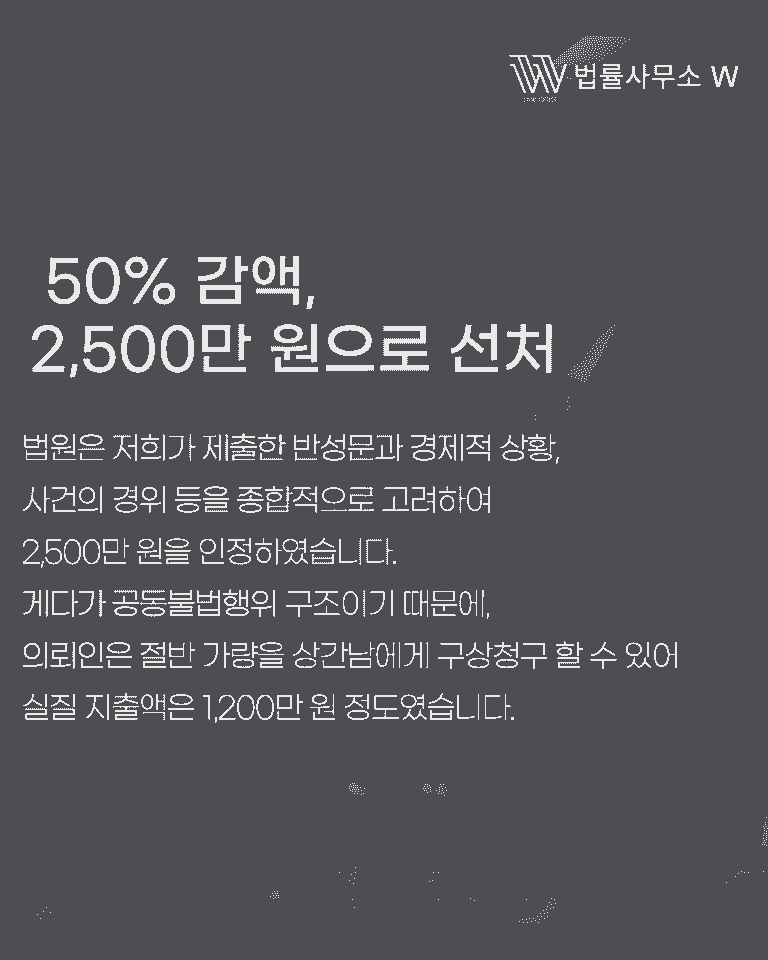 게다가 상간소송은 공동불법행위이기 때문에, 의뢰인은 같은 책임이 있는 상간남에게 절반을 구상청구할 수 있습니다. 실질적인 금전 부담은 1,200~1,300만 원 수준으로 방어된 셈입니다.