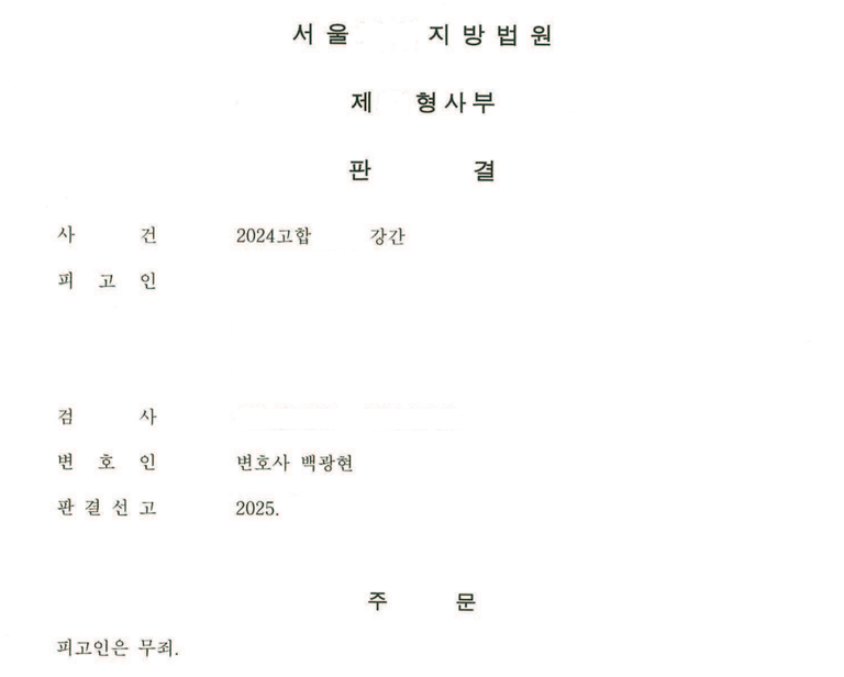 재판부는 본 변호인의 주장을 받아들여 의뢰인에게 '무죄'를 선고하였습니다. 혹시라도 억울하게 성범죄자가 되어 직장을 잃게 되거나 구속되는 일이 생기지는 않을까 오랜기간 고통받아오셨던 의뢰인께서는 비로소 웃음을 되찾으셨고, 거듭 본 변호인의 조력에 감사함을 표현해주셨습니다.