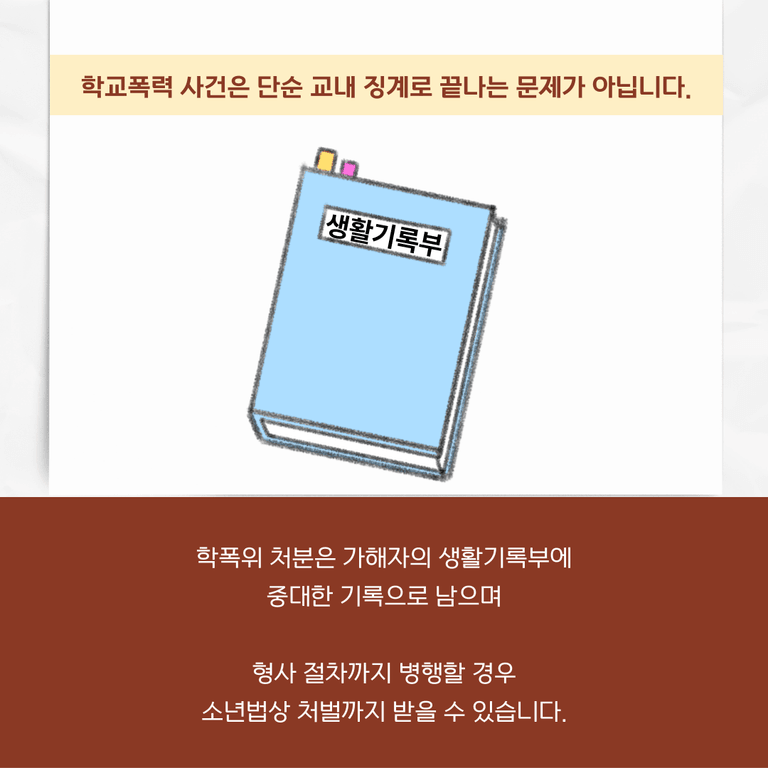이는 가해 학생들의 생활기록부에 기록되어 이후 상급학교 진학 시 불이익을 받을 수 있습니다.