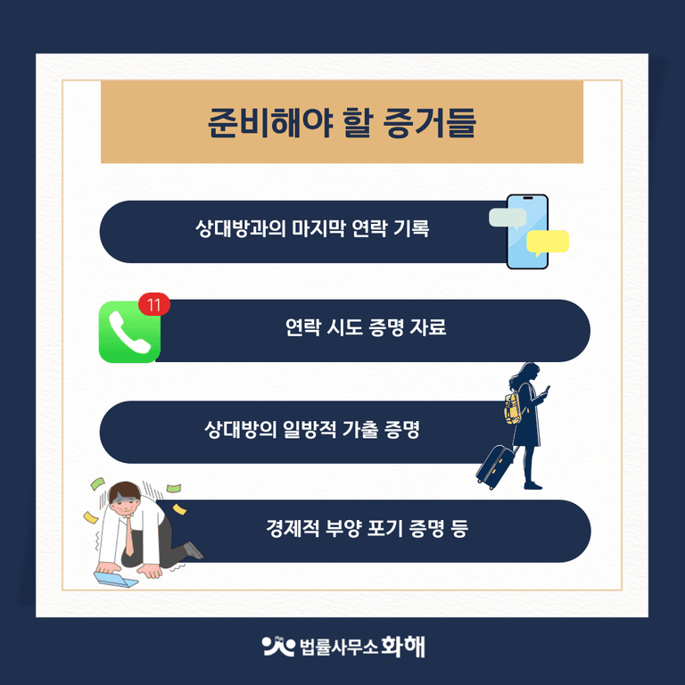 또한 상대방의 가족이나 친구들을 통해서도 연락을 시도해보시고, 이 과정에서 나눈 대화 내용도 메모해두세요. "언제 누구에게 어떤 방식으로 연락을 시도했는데 어떤 반응이었다"는 식으로 상세히 기록해두면 나중에 법원에서 인정받을 가능성이 높아집니다.