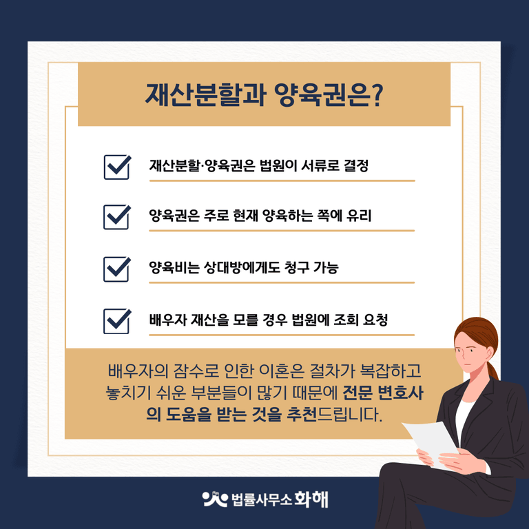 잠수이혼의 경우에도 일반 이혼과 마찬가지로 재산분할과 양육권 문제를 해결해야 하는데요. 상대방이 법정에 나타나지 않더라도 법원에서는 제출된 자료를 바탕으로 재산분할 비율을 정하고 양육권자를 결정합니다.