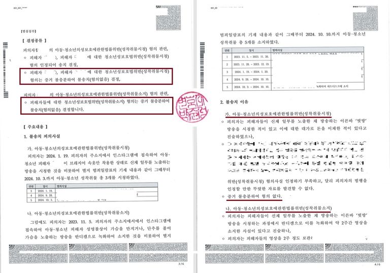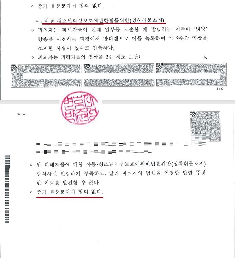 이 사건의 경우, 애초에 피해자 4명에 대한 아청물 소지 시청으로 자수하였으나, 그 중 2명에 대한 시청 부분만 인정되어 송치된 상태이고, 소지죄 전부는 무혐의, 나머지 2명에 대한 시청죄도 무혐의로 결론이 지어졌습니다.