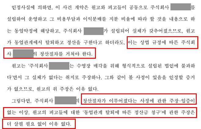 # 주식회사가 설립된 경우, 주식회사 청산절차가 아닌 한 동업관계 탈퇴에 기한 정산금 청구는 인정되지 않는다.