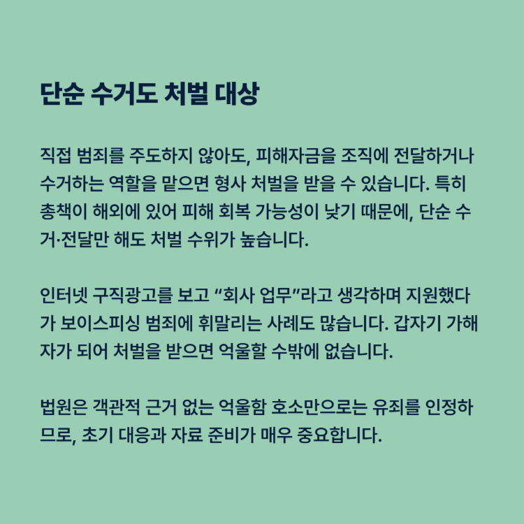직접 범죄를 주도하지 않아도, 피해자금을 조직에 전달하거나 수거하는 역할을 하면 형사 처벌을 받을 수 있습니다. 총책이 해외에 있어 피해 회복 가능성이 낮기 때문에, 단순 수거 또는 전달만 해도 처벌 수위가 높습니다.