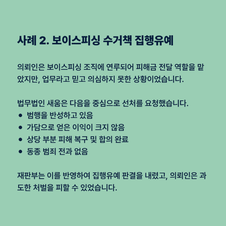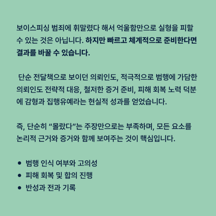 보이스피싱 범죄에 휘말렸을 때, 억울하다고 느낀다고 해서 저절로 실형을 피할 수 있는 것은 아닙니다. 하지만 누구보다 빠르게, 체계적으로 준비한 사람은 결과를 바꿀 수 있습니다.