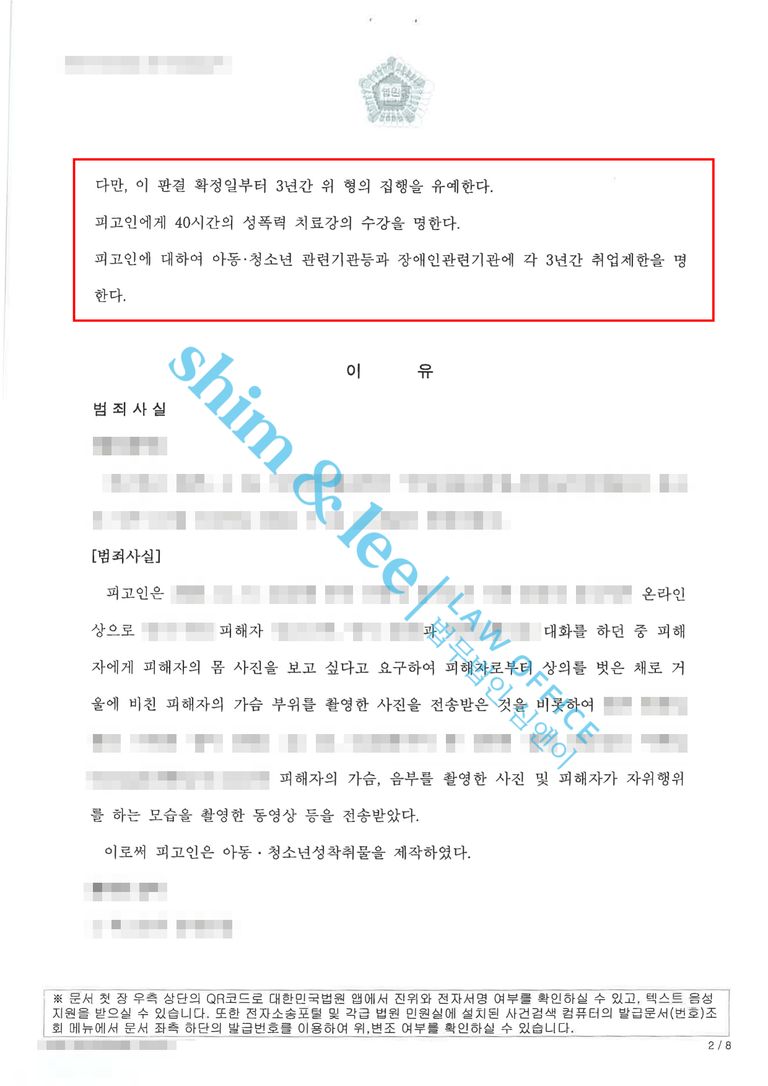 - 가해자는 범행을 인정하고 합의하였음에도 불구하고, 미성년자인 피해자의 건전한 성적 가치관 형성에 부정적인 영향을 끼친 점, 피해자 가족들이 이 사건으로 받은 충격 또한 상당한 점에서 죄질이 무겁다고 판단되었습니다. 이에 재판부는 최종적으로 징역 2년, 집행유예 3년과 함께 성폭력 치료강의 40시간, 취업제한 3년을 선고하였습니다.
