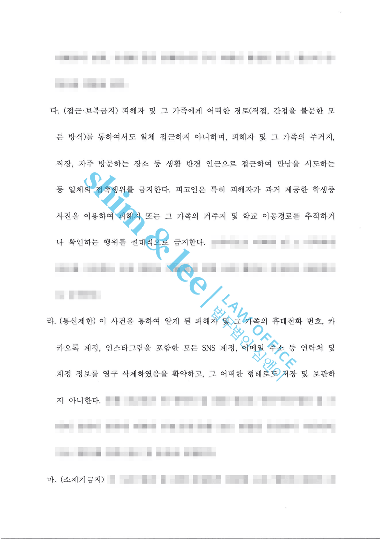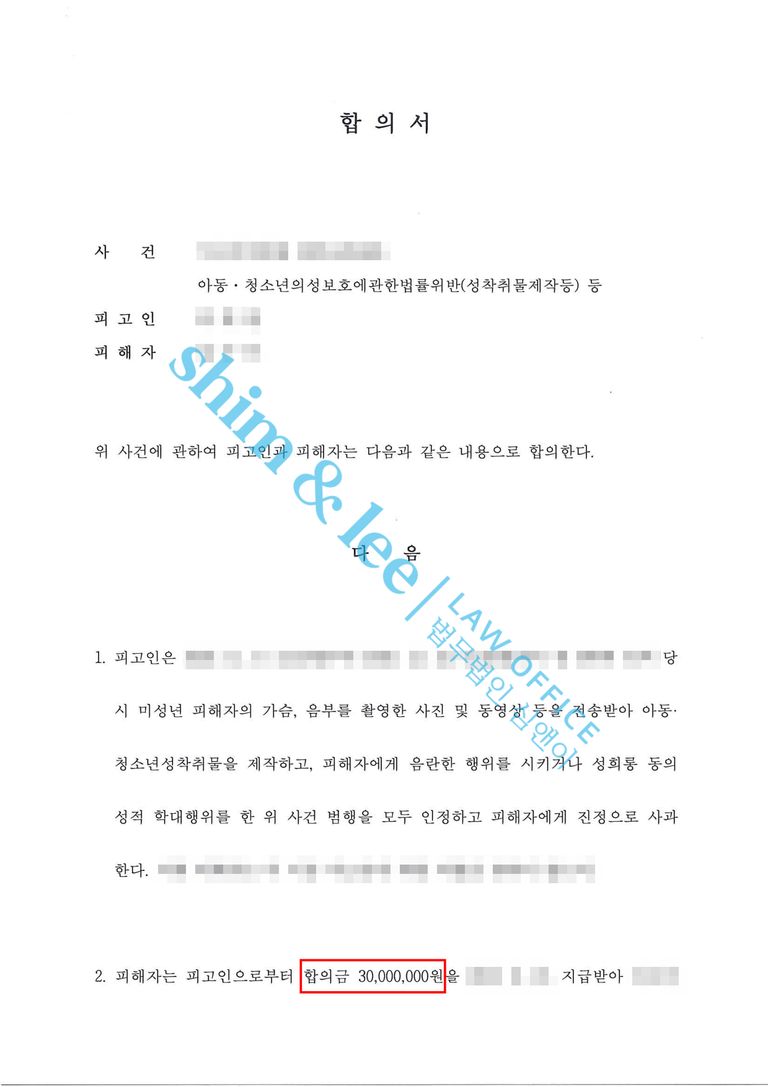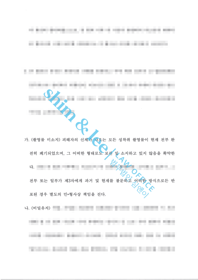 - 이에 심앤이는 촬영물 미소지, 비밀유지, 접근·보복 금지, 통신제한, 소제기금지 등 핵심 조항과 함께 해당 조항을 1회라도 위반할 경우 합의금의 배액을 추가 지급하도록 한 위약벌 조항까지 포함하여, 의뢰인을 최대한 보호할 수 있는 구체적인 조항을 꼼꼼히 작성하여 합의를 성사해냈습니다.