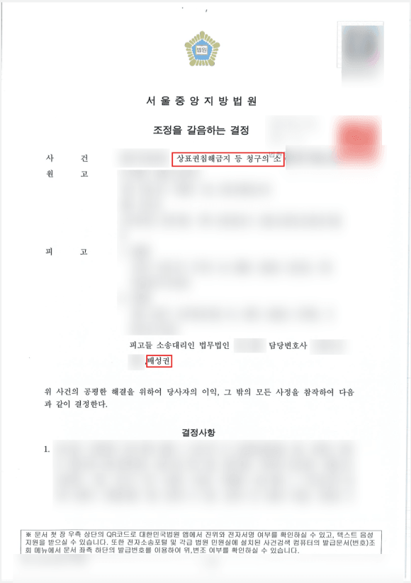 안녕하세요, 인천 법률사무소 송지 배성권 변호사입니다. 저는 상표권침해 사건을 주로 다루면서 원고 측과 피고 측 모두 두루 대리하고 있습니다. 오늘 소개할 사례는, 피고 측을 대리하여 상표권침해 사건에서 조정을 성립시킨 케이스입니다.