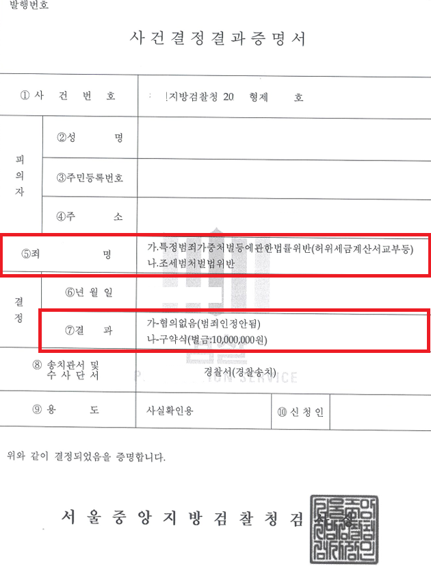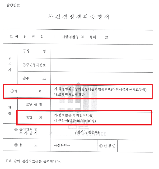 📌특정범죄가중처벌등에관한법률위반(허위세금계산서교부등) → 혐의 없음(범죄 인정 안됨)